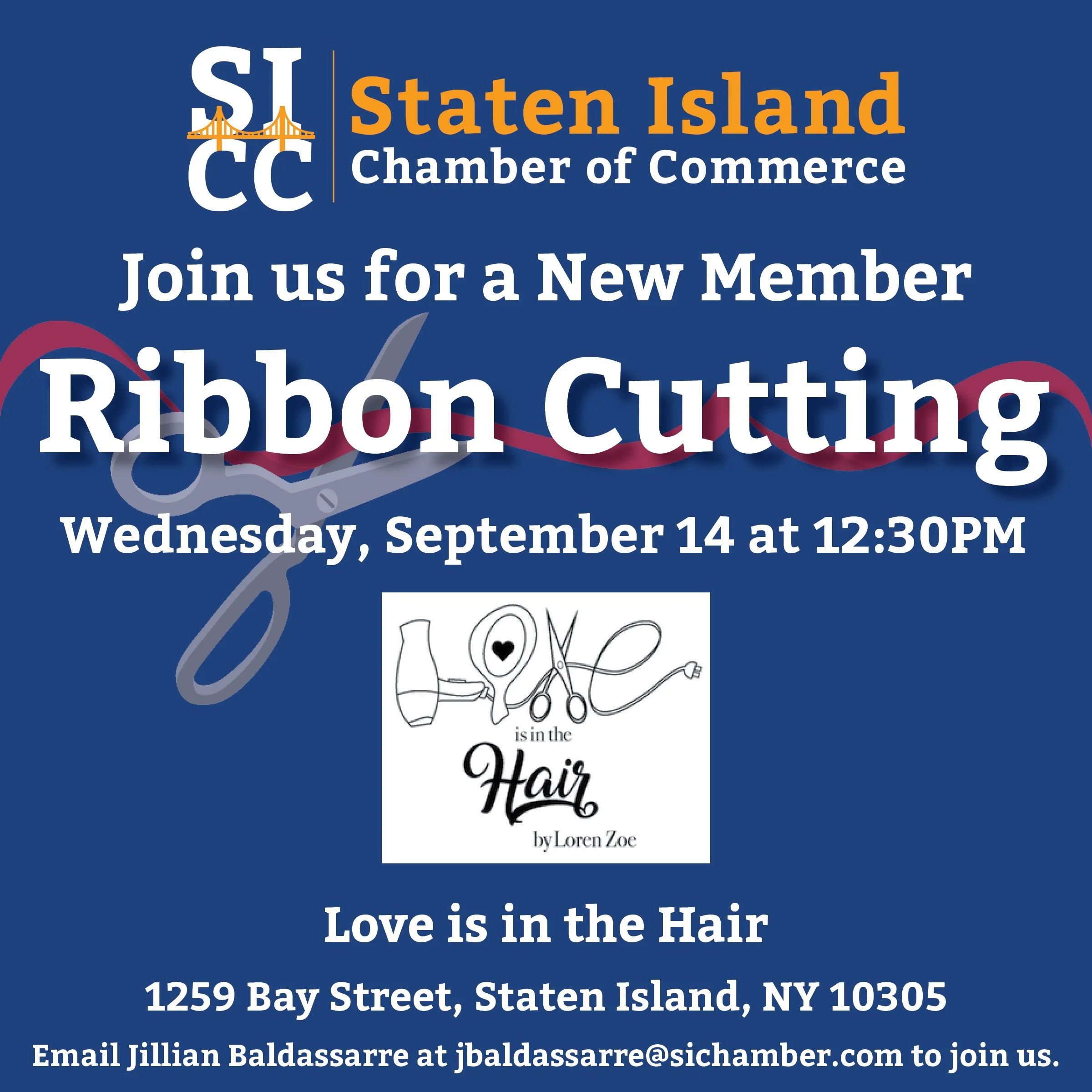 Back to All Events Love is in the Hair: New Member Ribbon Cutting Wednesday, September 14, 2022 12:30 PM 1:35 PM Google Calendar ICS Email Jillian Baldassarre at jbaldassarre@sichamber.com to join us.